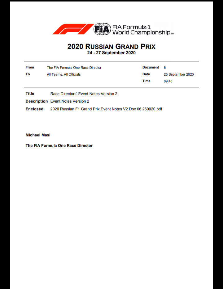 Previo a cada Gran Premio, Michael Masi; el director de carrera de Fórmula 1 para la FIA envia un boletín con los cambios que hay dentro de la pista, como también notas sobre el reglamento, protocolos o aclaraciones.