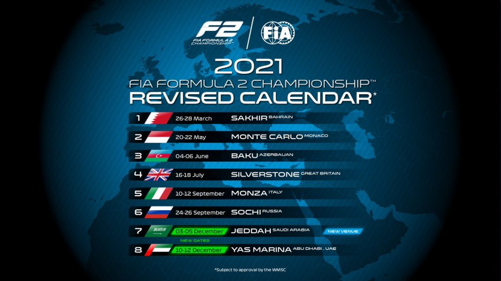 Como se comentó anteriormente, este año se ha reducido el número de citas de 12 a 8, con el objetivo de reducir costes. Además, se producirá una alternancia en las fechas con el campeonato de Fórmula 3, que sufrirá el mismo cambio en la composición del calendario. Como principal novedad en cuanto a circuitos, la categoría visitará un nuevo país (Arabia Saudita) que acogerá por primera vez un Gran Premio de Fórmula 1, en el que prometen que será el circuito urbano más rápido del mundo.
