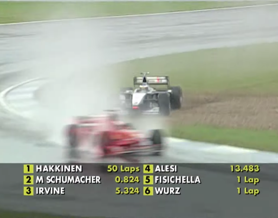 A 20 vueltas del final, la lluvia estaba causando estragos en la pista, Coulthard abandonó en la vuelta 37 tras despistarse en la pista húmeda, mientras que Hakkinen paso un susto en la vuelta 42 cuando hizo un trompo a alta velocidad a la salida de la curva Bridge, perdiendo diez de sus 49 segundos de ventaja por sobre Schumacher.