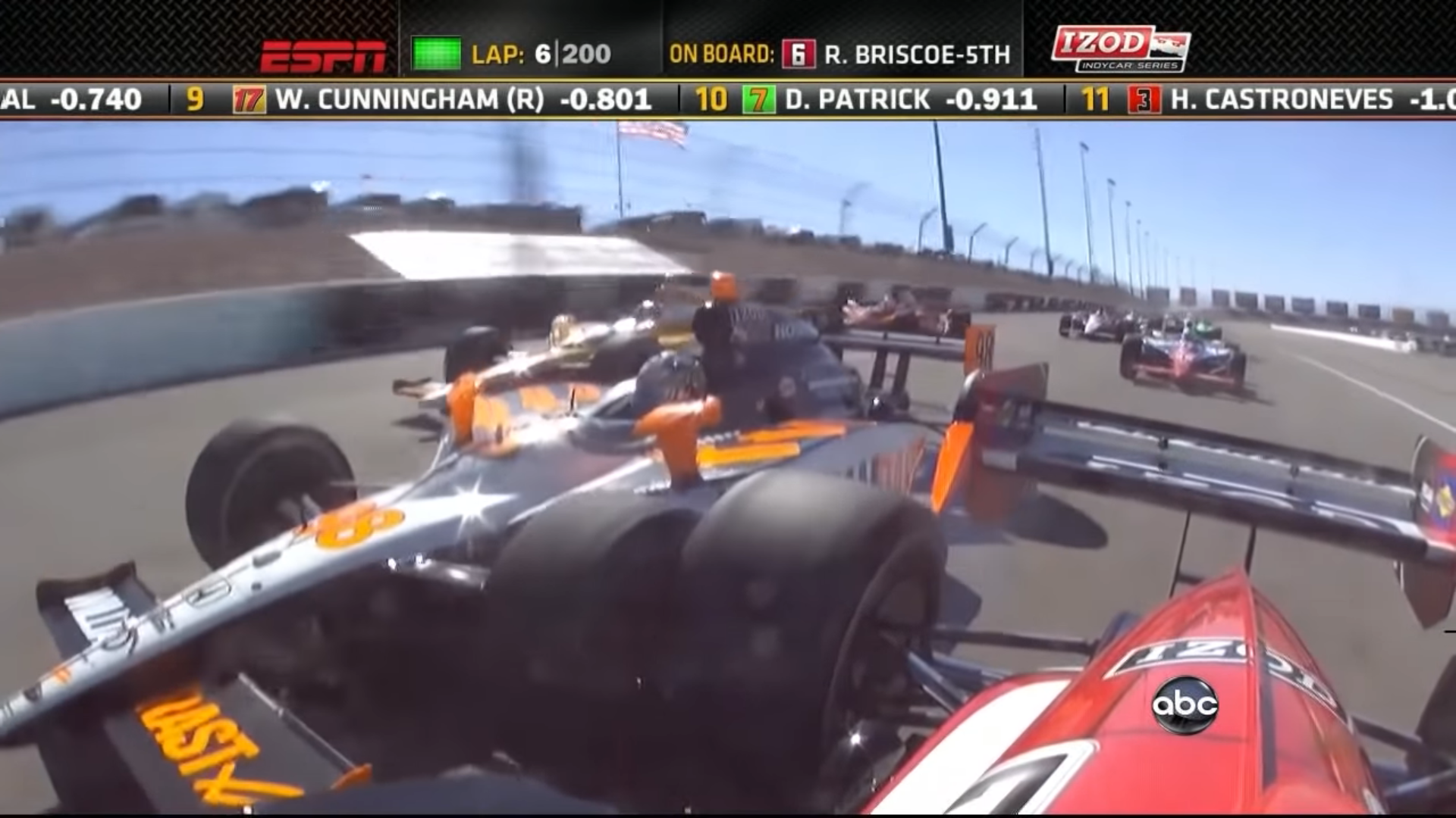 Iniciada la vuelta 11, el auto de James Hinchcliffe (#06) hizo contacto con el auto de Wade Cunnigham (#17) entrando a la primera curva mientras batallaban por la posición 12. Cunnigham perdió el control haciendo un semitrompo para quedar en medio de la trayectoria del auto manejado por JR Hildebrand (#4), el cual impactó con su neumático delantero derecho el neumático delantero izquierdo del auto de Cunnigham y dando inicio al accidente múltiple entre las curvas uno y dos. Por un periodo breve de tiempo Hildebrand voló por los aires para terminar impactando a Jay Howard (#15) con ambos yéndose al muro y pasando a llevar al auto de Townsend Bell (#22), el cual impactó el muro con el lado izquierdo de su auto.