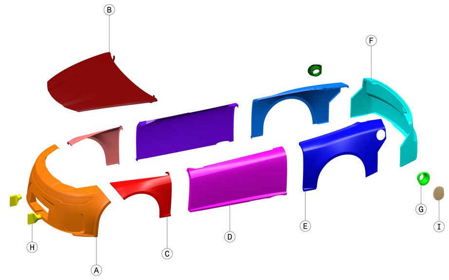 Estas piezas están en uso en la Xfinty Series desde 2017 y desde 2019 que son obligatoria en la construcción de sus autos. La instalación de los paneles compuestos lleva menos tiempo en instalar, en comparación a lo que era crear, dar forma y solar partes de una carrocería de acero.