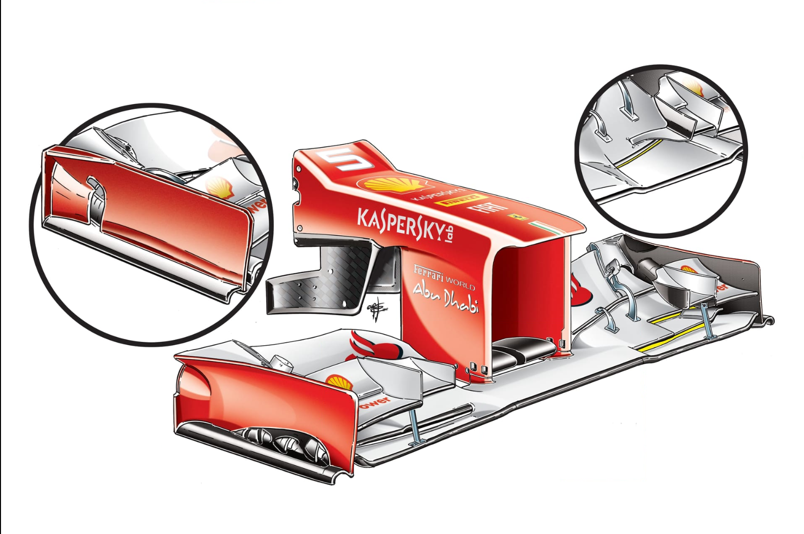 La nueva versión del alerón se caracterizaba por tener una cuerda del plano principal más corta y deflectores más refinados. Según Gary Anderson en su análisis para la revista Autosport, el objetivo de Ferrari con el alerón era tener más consistencia y perder la menor cantidad de downforce cada vez que el alerón se acercaba a la superficie o al momento de ir a alta velocidad.