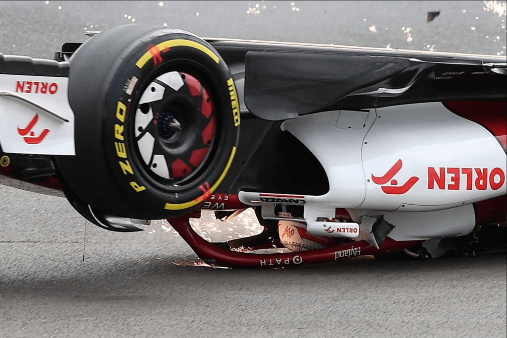 Zhou se volcó tras ser impactado por George Russell en los primeros metros de la largada antes de llegar a la curva Abbey. Quedando al lado izquierdo de un Sándwich de autos entre Russell y Pierre Gasly en lo que fue un efecto domino que acabó con Zhou volcándose tras ser impactado con el neumático delantero izquierdo del Mercedes en el neumático trasero derecho de su auto. Al ser en la largada, la diferencia de velocidades entres los distintos autos llevó a que el volcamiento fuera más violento.