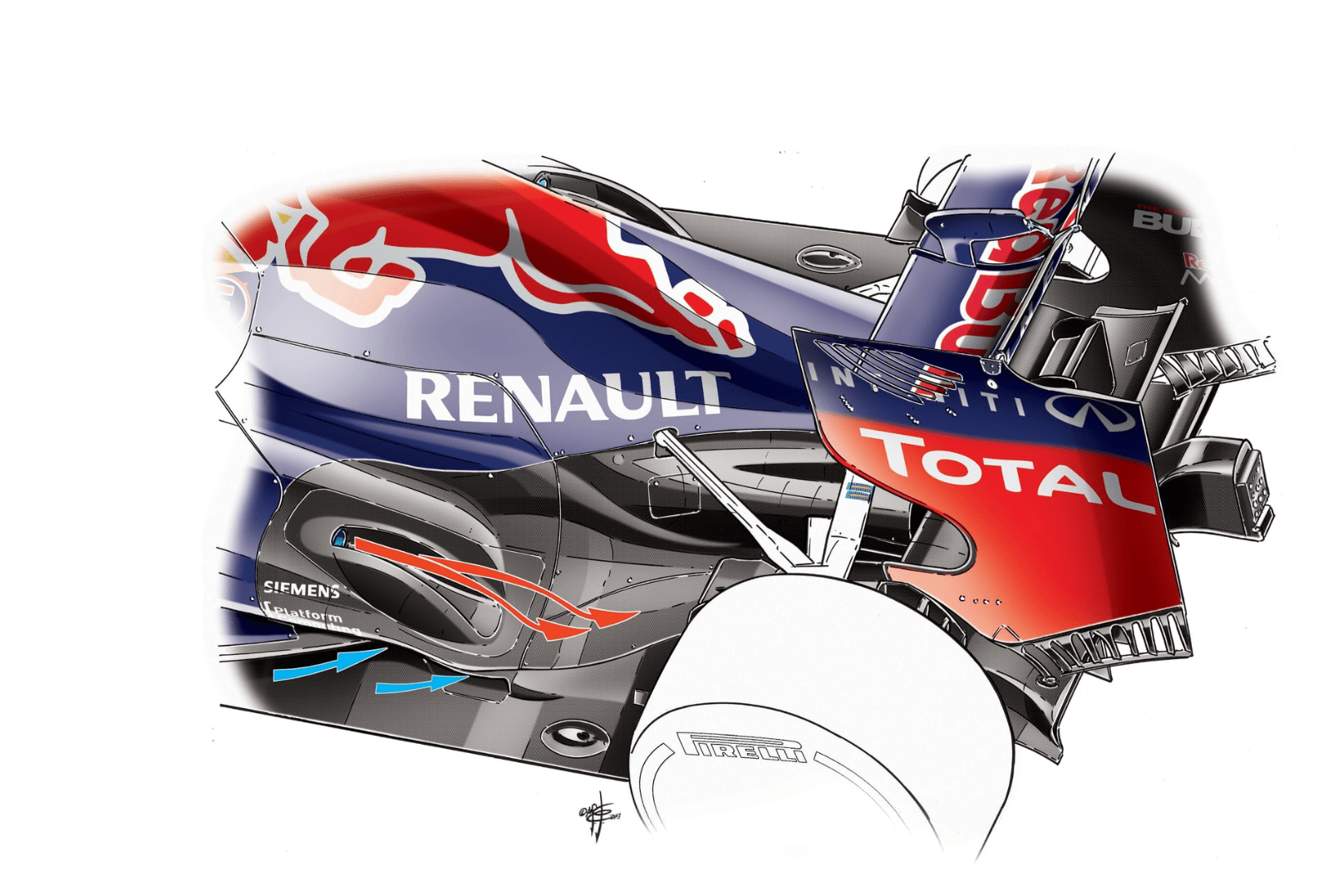 Durante la primera parte de la temporada, Red Bull introdujo una nueva especificación de alerón delantero para circuitos donde se corre con mayor carga aerodinámica, que se caracterizaba por tener una punta más alta y una parte inferior plana que facilitaba el flujo de aire hacía todo el piso del auto y difusor.