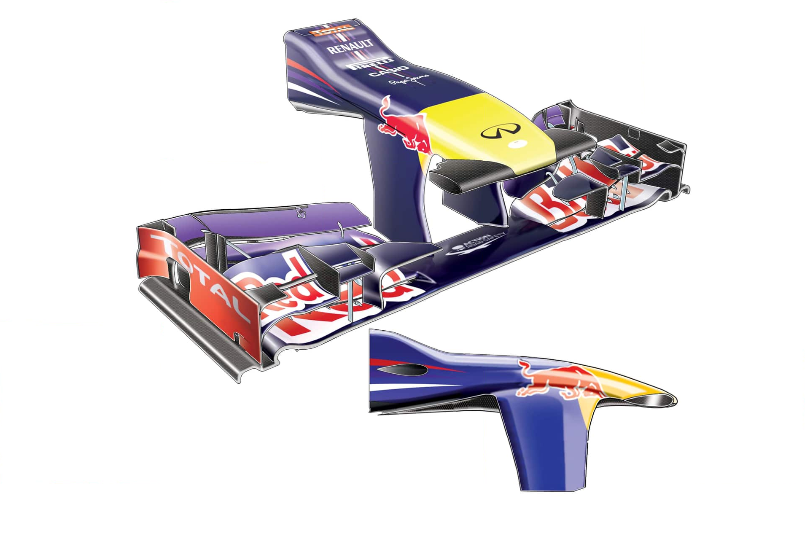 Durante la primera parte de la temporada, Red Bull introdujo una nueva especificación de alerón delantero para circuitos donde se corre con mayor carga aerodinámica, que se caracterizaba por tener una punta más alta y una parte inferior plana que facilitaba el flujo de aire hacía todo el piso del auto y difusor.