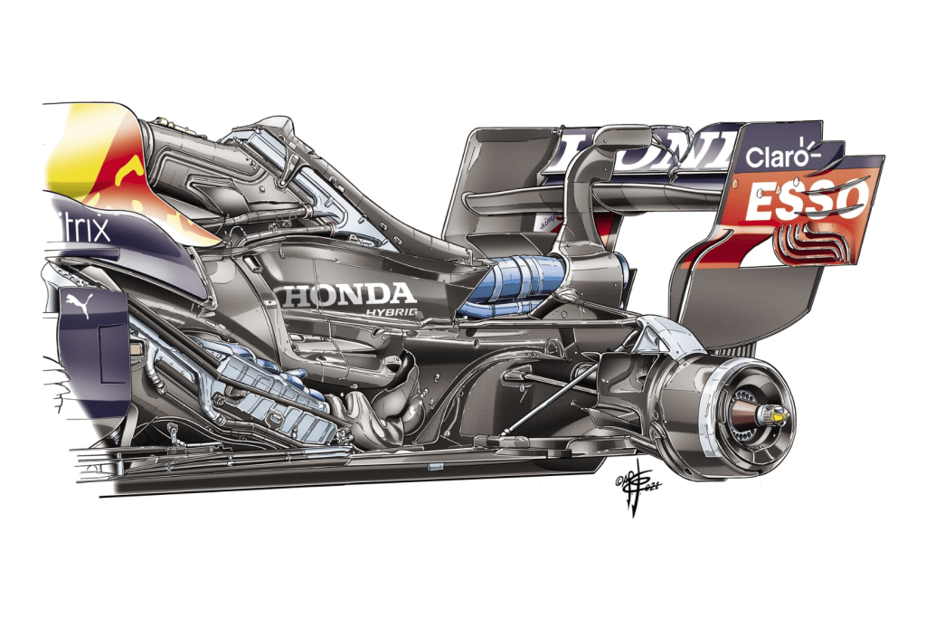 Al tener un chasis más largo, entrega un mayor espacio para trabajar en la aerodinámica de los autos, incluso si los autos son más pesados y menos agiles en comparación a sus antecesores. Con los turbos híbridos y su complejo empaquetado de componentes como es el motor de combustión interna, sistemas de recuperación de energía, turbocargador, baterías, centralita y escapes.