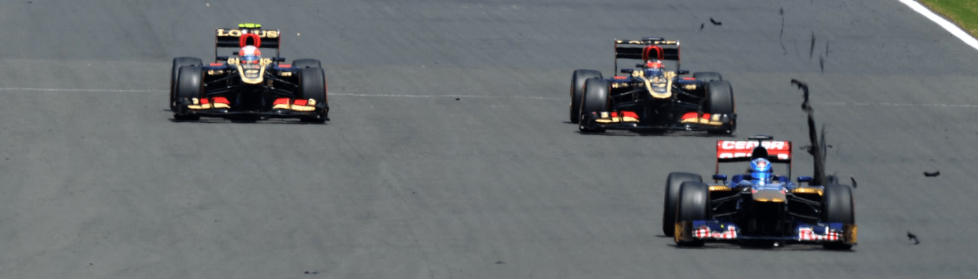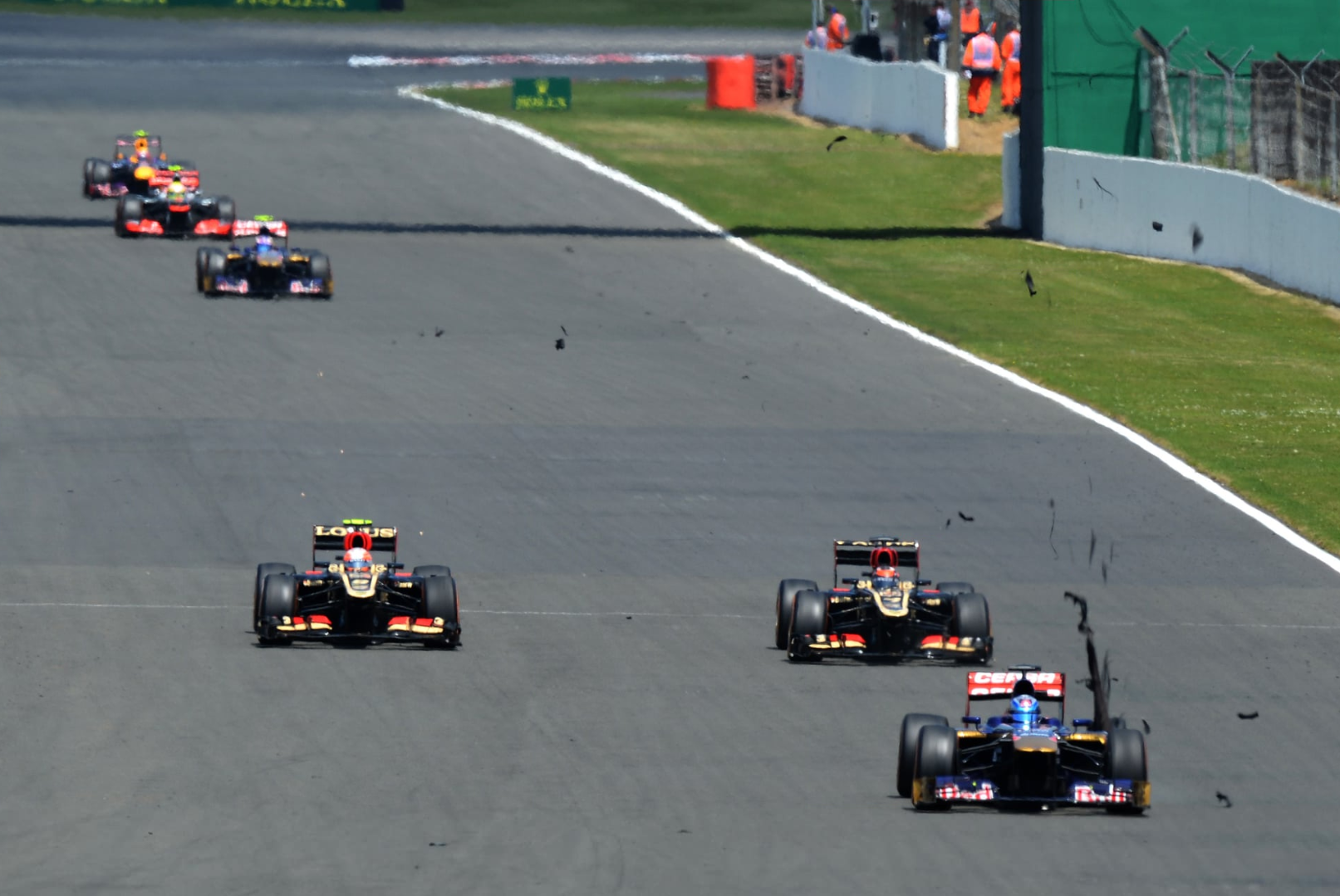 Jean Eric Vergne fue el cuarto piloto en sufrir de un pinchazo en la vuelta 13 cuando el neumático trasero izquierdo de su Toro Rosso explotase a toda velocidad en Hangar Straight y que tuvo a Kimi Raikkonen haciendo acción evasiva al momento de intercambiar posición con su compañero de equipo, Romain Grosjean.