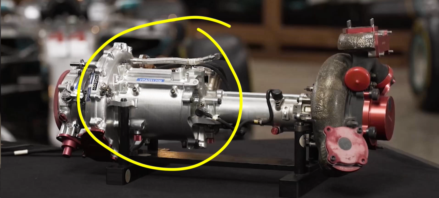 El Split Turbo es cuando la turbina del turbo y el compresor están separados por un cigüeñal, en el caso de Mercedes tenía también al MGU-H y con ello trayendo grandes beneficios como la reducción de peso y de espacio para empaquetado de la Unidad de Potencia, separando el aire caliente del compresor.