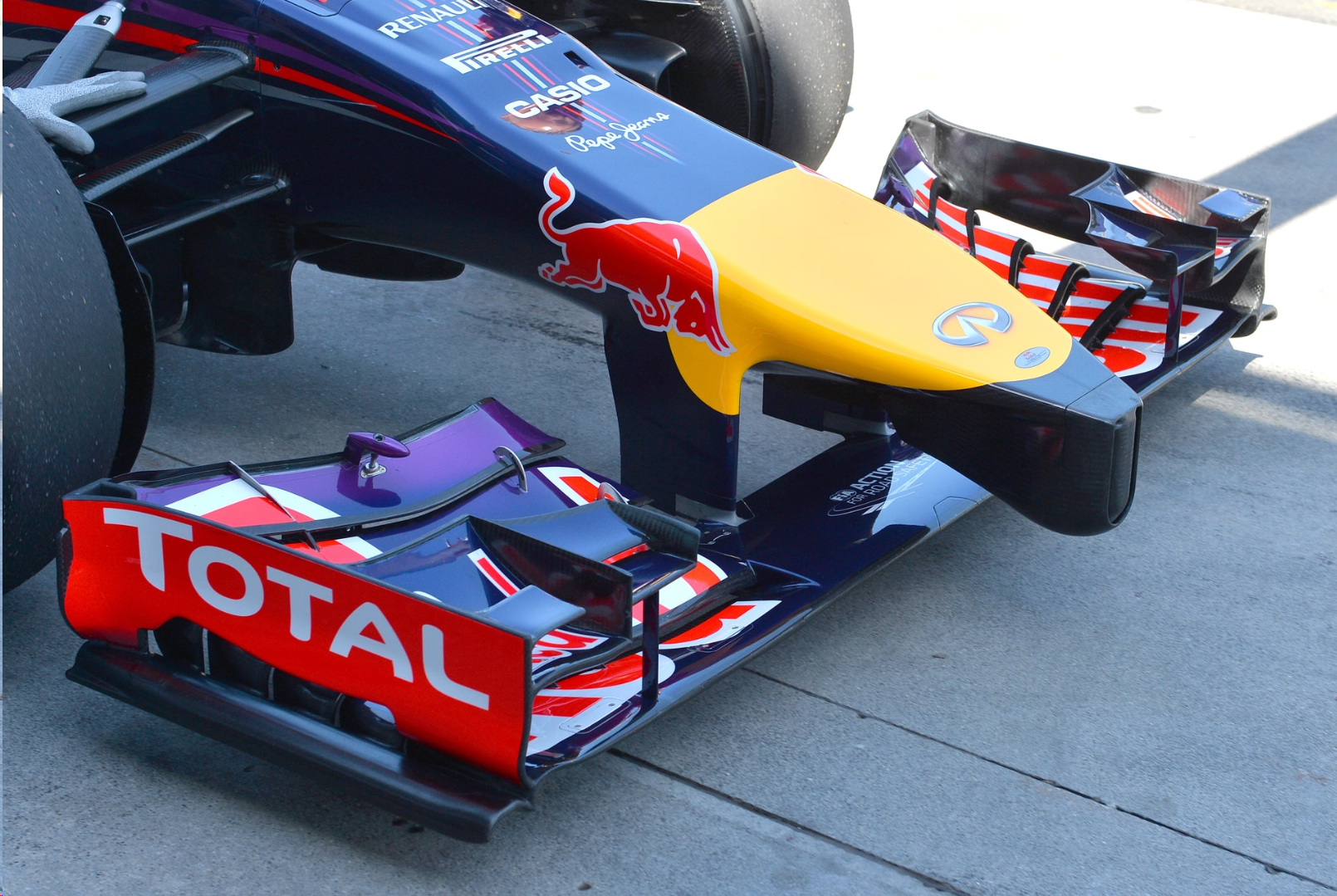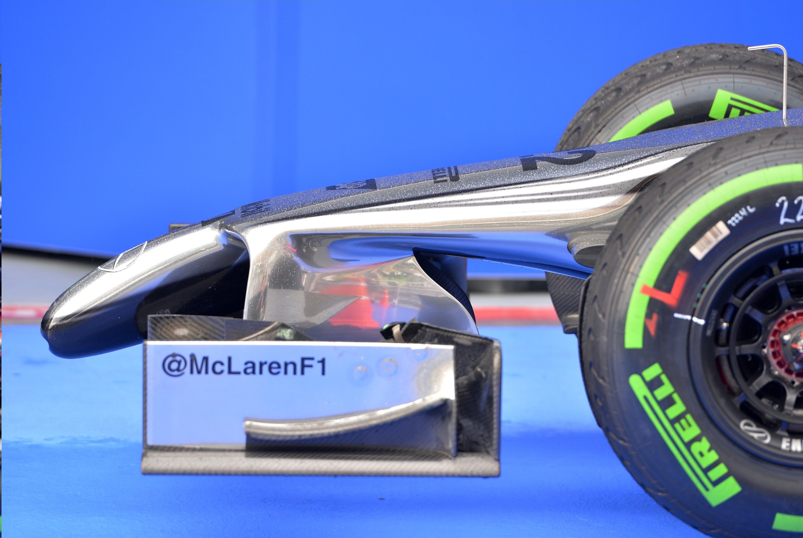 El alerón delantero tuvo una radical transformación de la mano de las nuevas regulaciones, achicando su tamaño de 1.800 mm a 1.650 para evitar los riesgos de pinchazo de neumáticos cada vez que los Endplates hicieran contacto y esparcieran en pista pedazos de fibra de carbono.