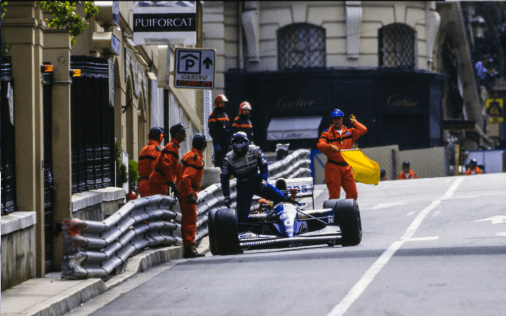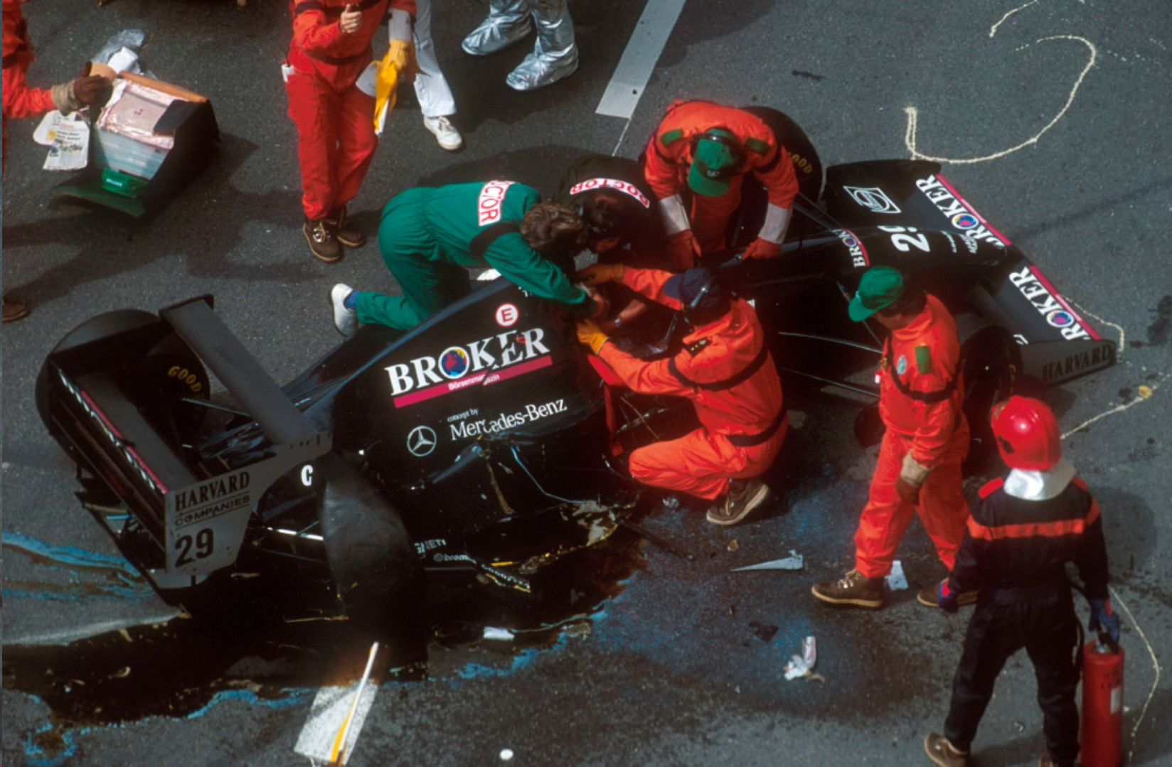El piloto austriaco trató de estirar su punto de frenado en la zona más veloz del trazado callejero, pero perdió el control al pasar por los baches, similar al accidente que Sergio Pérez tuvo en ese mismo lugar en 2011. Dada la nula protección que había en las cabinas en ese entonces, la cabeza de Wendlinger golpeó violentamente con las barreras quedando inconsciente y en coma inducido por 20 días en un hospital en Niza.