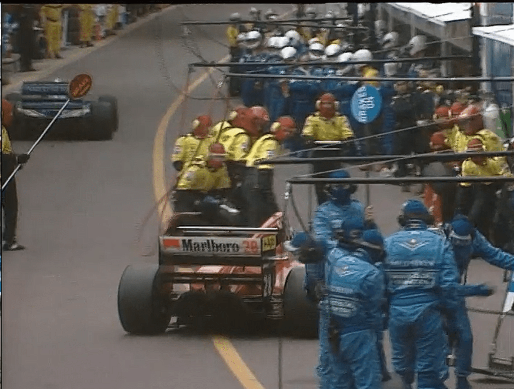 En la vuelta 42, el líder de la carrera paso un susto cuando se topó con el Tyrrell Yamaha de Mark Blundell, quien abandonó St. Devote por una falla de motor que dejo aceite tirado justo en la línea de carrera. El piloto alemán con un bravo volantazo evitó perder el control y golpear las barreras, mientras que Berger se fue de largo por la escapatoria, quedando a merced de Brundle quien lo superó por la línea exterior a la salida de la curva del Casino.