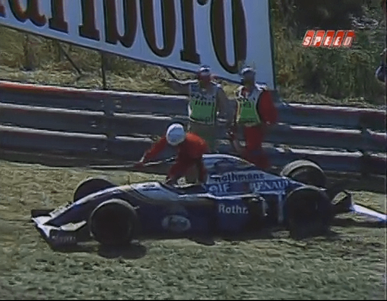 David Coulthard iba rumbo a su primer podio en Fórmula 1, pero perdió el control de su FW16B e impactó con las barreras, destrozando el tren trasero a menos de 20 vueltas para el final, poniendo fin a un complicado fin de semana para escoces.