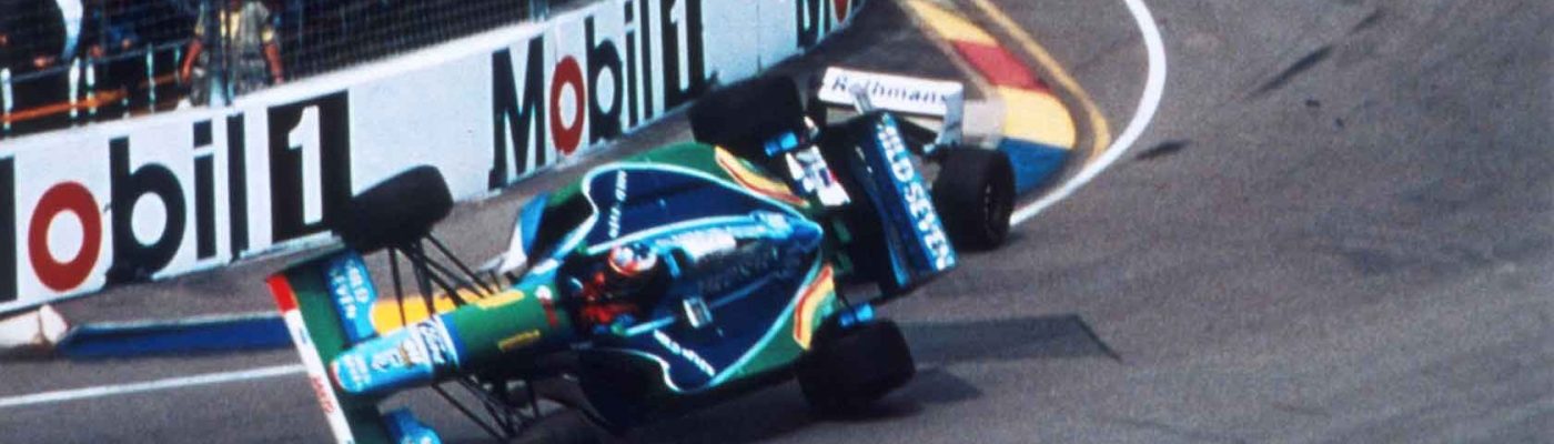«Cuando doble en la curva todo lo que pude ver fue a Michael saliendo del pasto zigzagueando en frente mío, pensé. ‘Él está tratando de ganar impulso y si lo permitía, él se alejará nuevamente y no podía dejar pasar esa oportunidad’. A la siguiente curva, mano derecha que vino de inmediato. Michael se movió hacía la izquierda y apareció dejar la puerta abierta, puse la parte delantera en ese espacio y aceleré. Michael se movió hacía la derecha, sin saber si estaba ahí o estaba tratando de cerrarme la puerta. Me tocó, mandando su auto con dos ruedas en el aire y casi a la derecha antes de golpear las barreras». – Extracto de Watching The Wheels, la autobiografía de Damon Hill