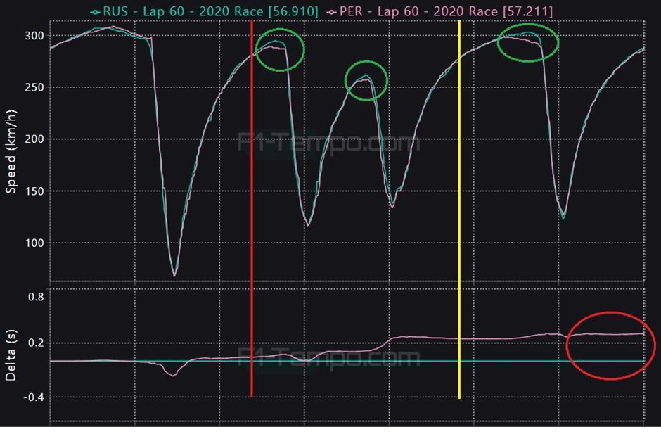 En pos de la gestión, Pérez frena antes que, por ejemplo, Russell. Esto tiene como fin una barrera térmica, limitar el calor de los neumáticos, minimizando su descaste. Así como una pequeña reducción de velocidad en curvas claves, reduciendo la carga aerodinámica y, con ello, la carga ejercida sobre los mismos. Todo esto, intentando mantener un delta lo más bajo posible.