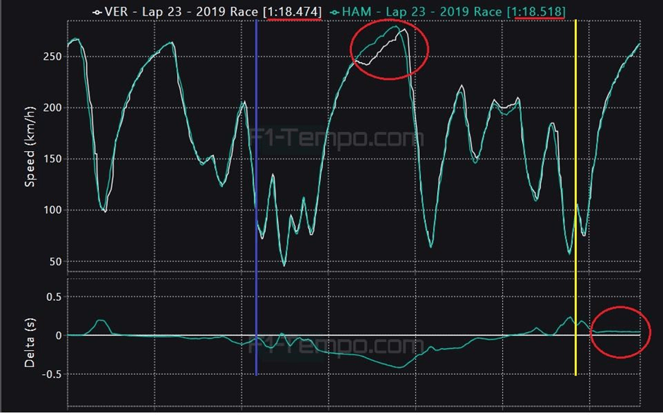 En esta misma línea, tenemos una clase magistral por parte de Lewis Hamilton, en Mónaco 2019. En la telemetría comparada de Hamilton y Verstappen de la vuelta 23, vemos de mejor forma como el piloto británico administra tanto las frenadas como la velocidad máxima, principalmente en el segundo sector, recuperando el delta en el último.