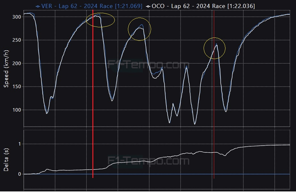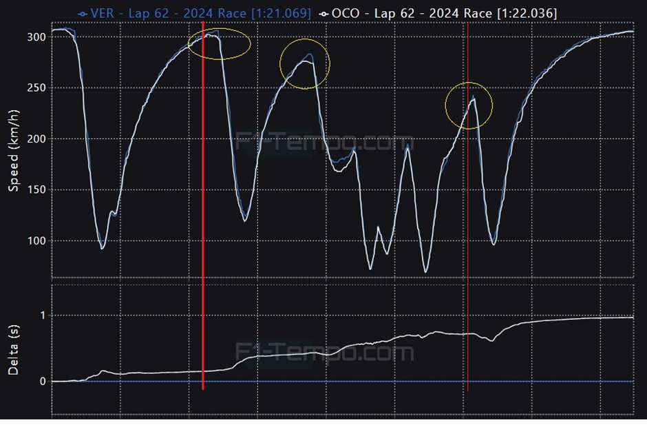 Inclusive vemos que al final de la vuelta, Verstappen aumenta de manera considerable el delta. Principalmente en el 3er sector, al encarar de forma agresiva la curva 12, donde -comparación telemétrica mediante- vemos que Ocon fue más cauteloso (lento). Esto muestra cómo, aun bajo condiciones climatológicas complejas, el tetracampeón puede mantener su ingenio y dominio sobre el resto.