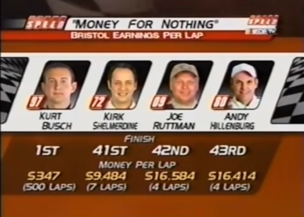 Un ejemplo claro de esta disparidad en los pagos ocurrió en Bristol. Kurt Busch, ganador de la carrera, ganó $347 dólares por vuelta tras completar las 500 vueltas. Sin embargo, los tres últimos clasificados, que apenas completaron entre 4 y 7 vueltas, ganaron entre $9,000 y más de $16,000 por vuelta en una proporción de pagos por vuelta llamativa. Belmont incluso afirmó que ganaba más dinero con el Start and Park en la Cup Series que ganando una carrera en la ARCA Series.